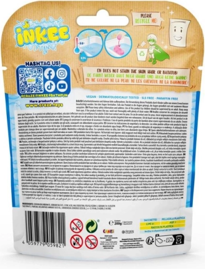 Produkty INKEE jsou navrženy s ohledem na děti i přírodu – jsou veganské, bez mikroplastů, bez SLS, bez parafínu a vhodné pro děti od 3 let. Baleno v praktickém sáčku s okénkem pro snadný výběr barvy.