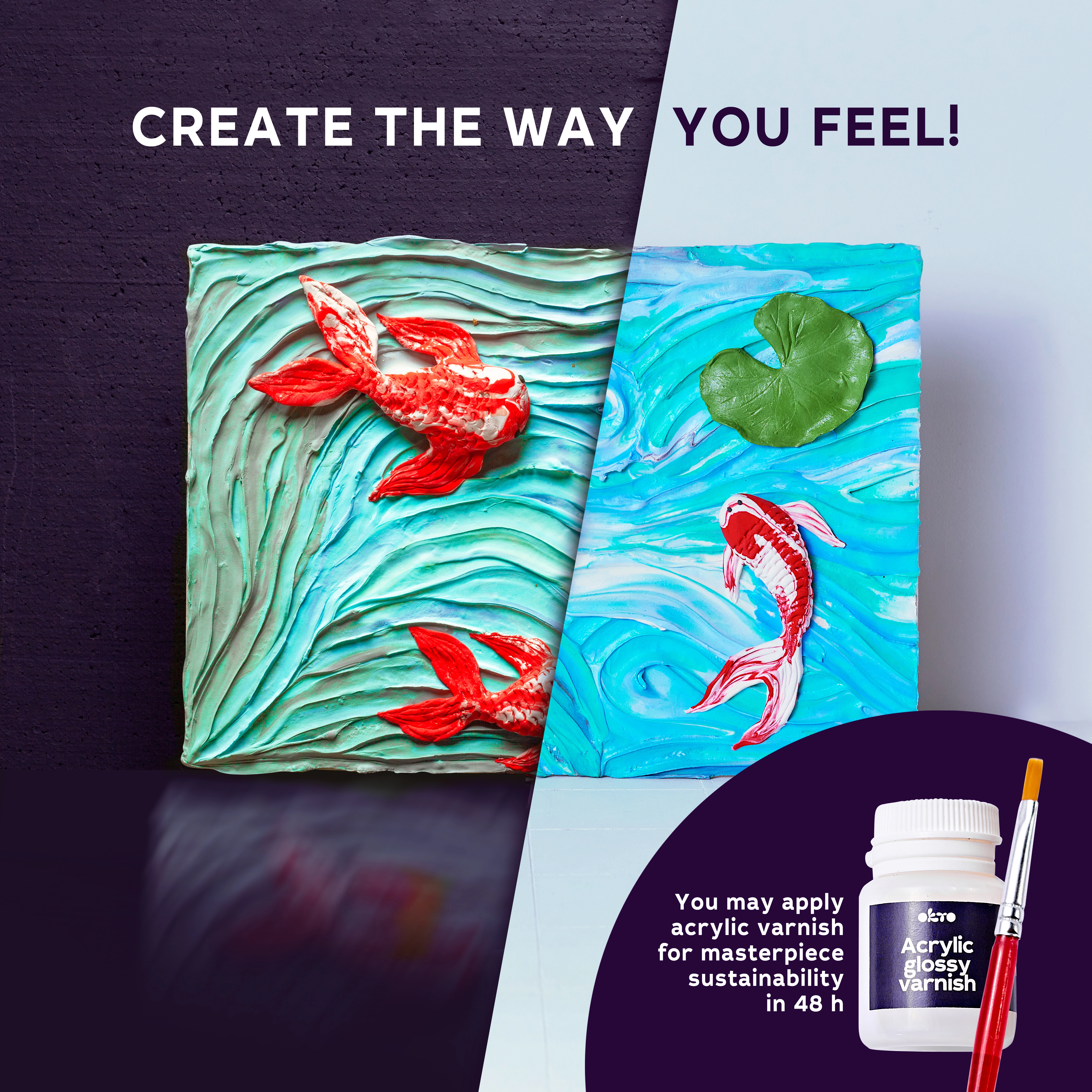 Tato kreativní sada je ideální pro začátečníky i pokročilé. Díky přiloženému návodu a dřevěnému tvarovacímu nástroji vytvoříte nádherný motiv kaprů koi s efektní strukturou. Přiložený akrylový (vodou ředitelný) lak dodá hotovému obrazu odolnost a jemný lesk.