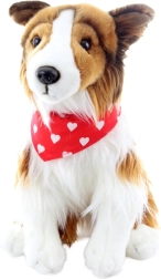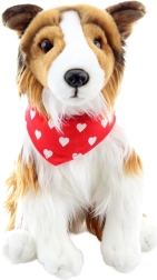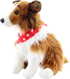 Tato plyšová hračka ve tvaru psa dlouhosrsté kolie je pokryta měkkým hnědo-bílým kožíškem a je ideální pro děti od 0 let. Je vybavena červeným šátkem s bílými srdíčky, což přidává na jejím kouzlu.