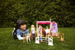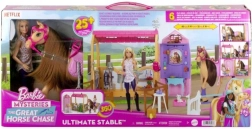 Zahrajte si na jezdecký den se setem Barbie Ultimate Stable, který nabízí celohrační prostředí na 360° a spoustu doplňků pro péči o koně. Děti mohou panence Barbie pomoci s krmením na stanici, s čištěním a kartáčováním ve zóně péče, trénovat skoky přes překážky a poté hrdě vystavit stužky na zdi s trofejemi. Nechybí ani růžová zahrádka „plug and play“ a možnost stáj jednoduše složit pro snadné ukládání.