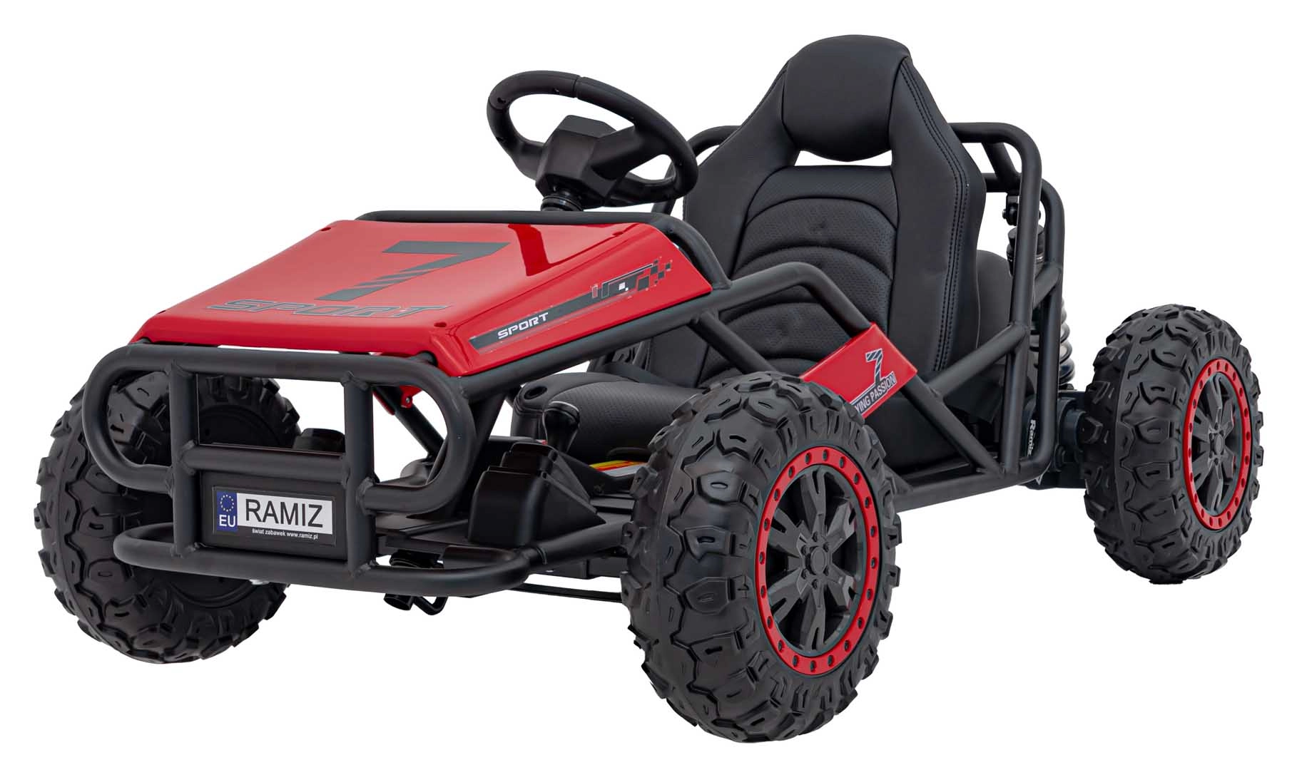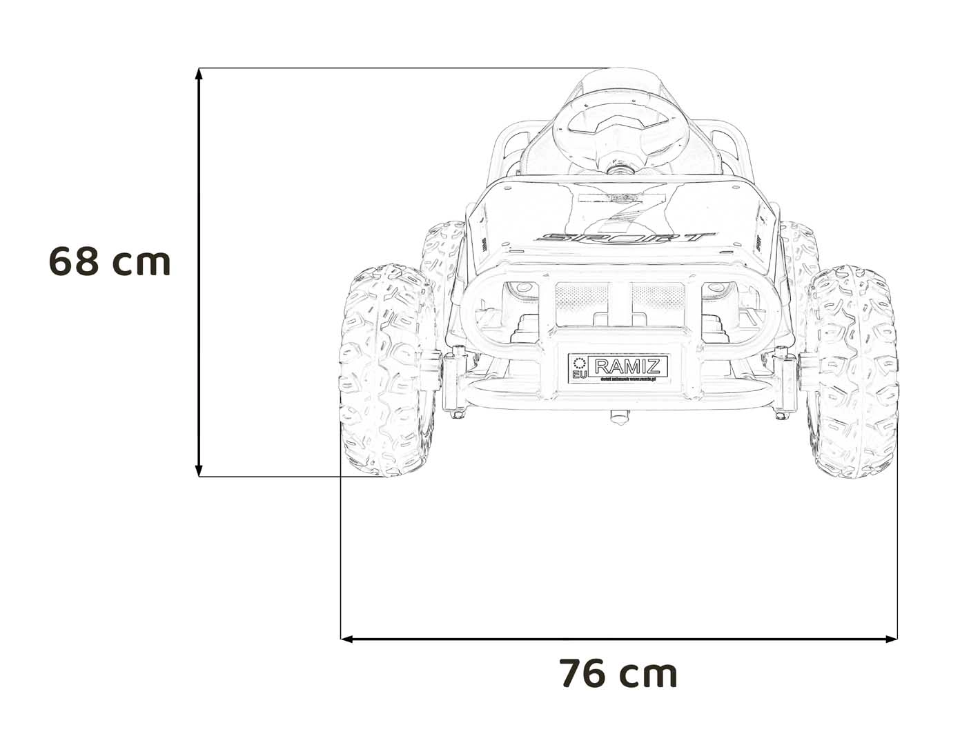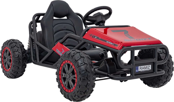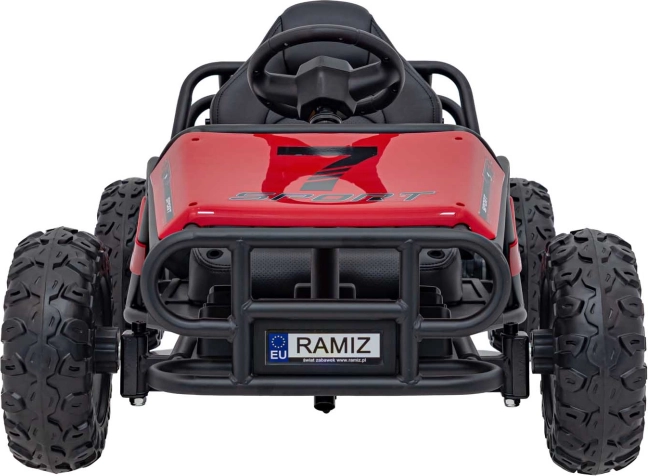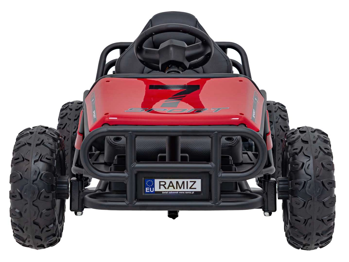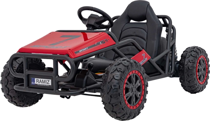 Sportovní dětská motokára RAMIZ je stvořená pro dobrodružství na zahradě i na nezpevněných cestách. Dva výkonné motory 2×100 W napájené 24V 10Ah akumulátorem poskytují jistý tah, plynulý start a možnost volby ze dvou rychlostí. Velká EVA kola 29×11 cm skvěle tlumí nerovnosti, zadní dvojité tlumiče přidávají stabilitu a 15 cm světlá výška umožní hladký průjezd překážkami.