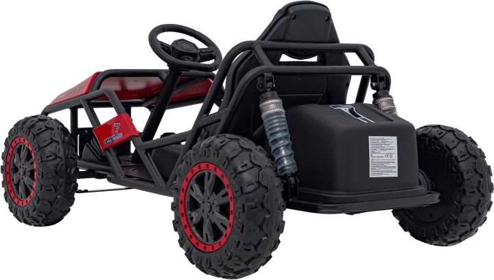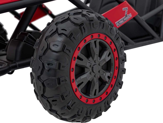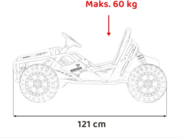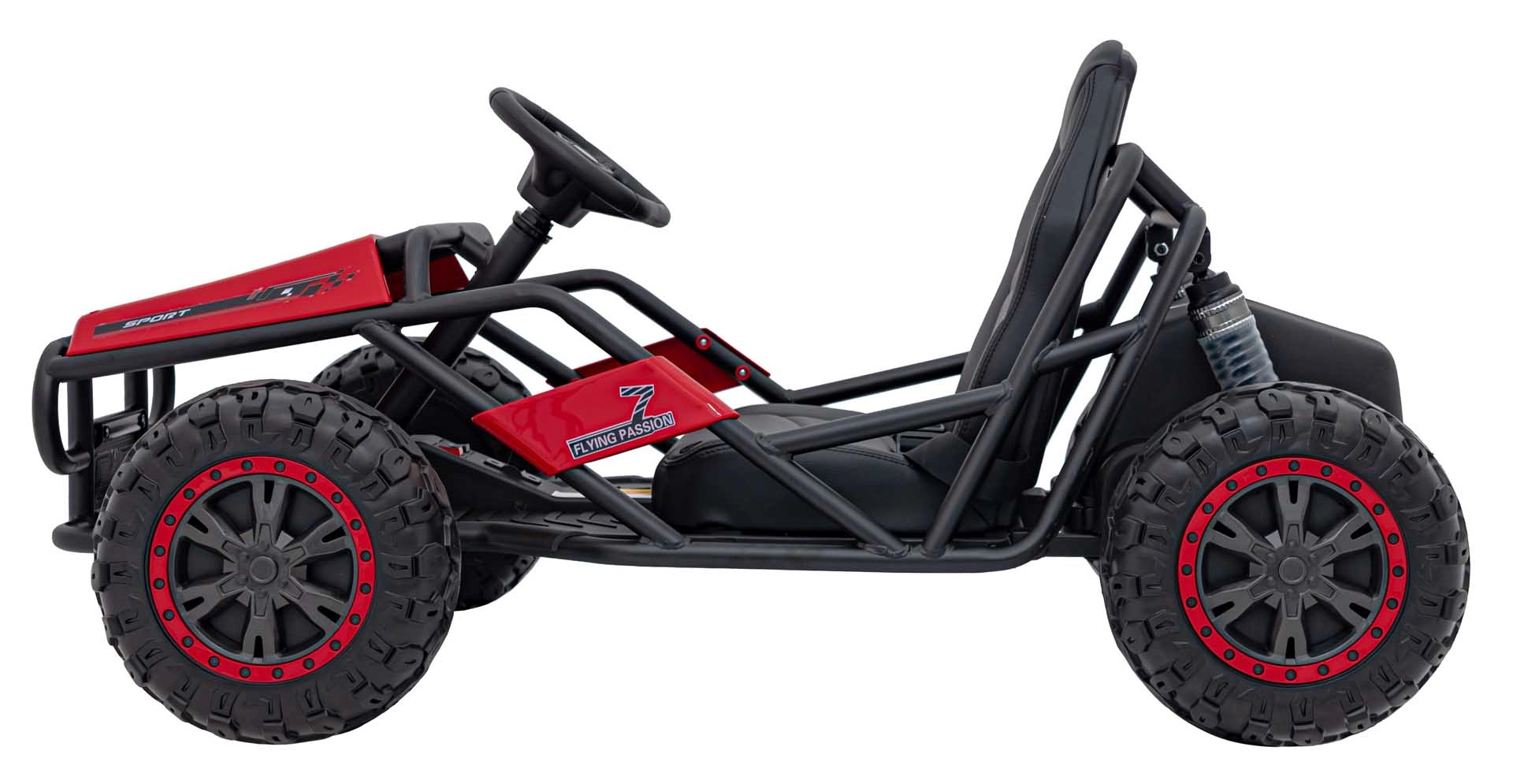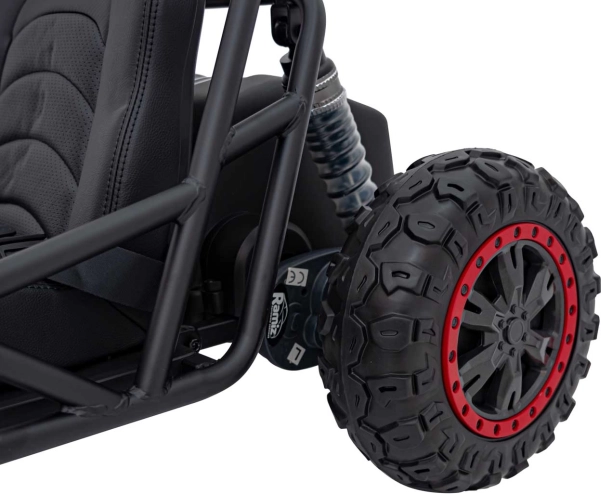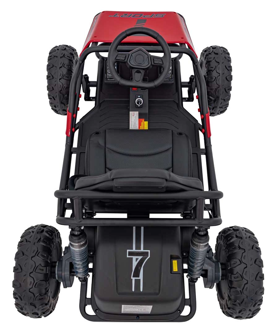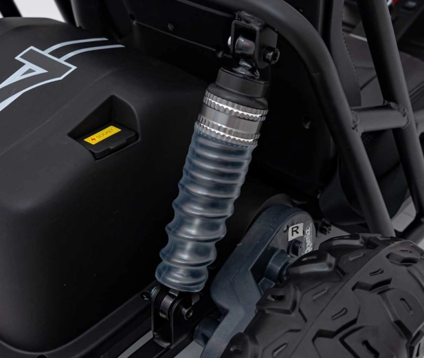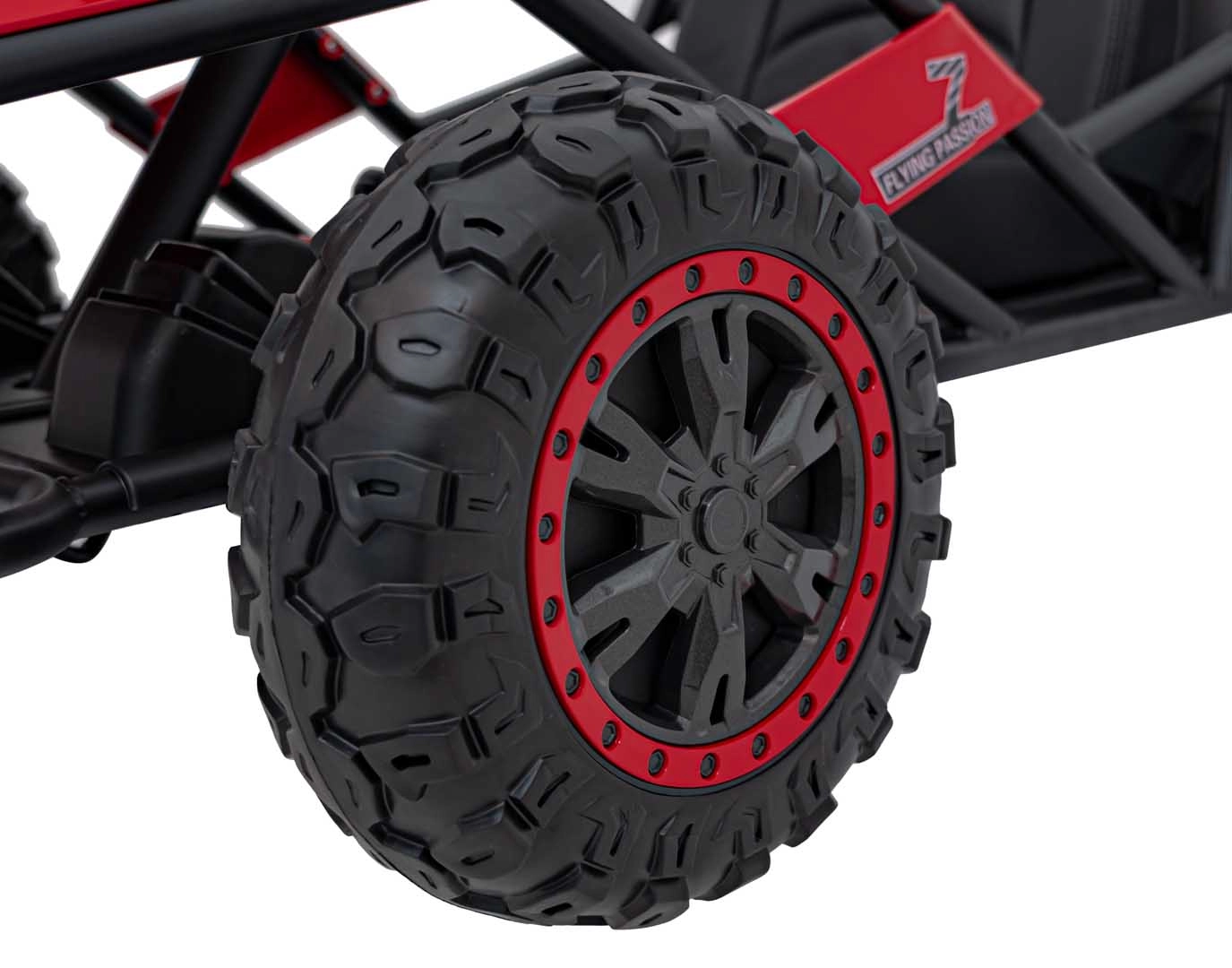 Sportovní dětská motokára RAMIZ je stvořená pro dobrodružství na zahradě i na nezpevněných cestách. Dva výkonné motory 2×100 W napájené 24V 10Ah akumulátorem poskytují jistý tah, plynulý start a možnost volby ze dvou rychlostí. Velká EVA kola 29×11 cm skvěle tlumí nerovnosti, zadní dvojité tlumiče přidávají stabilitu a 15 cm světlá výška umožní hladký průjezd překážkami.