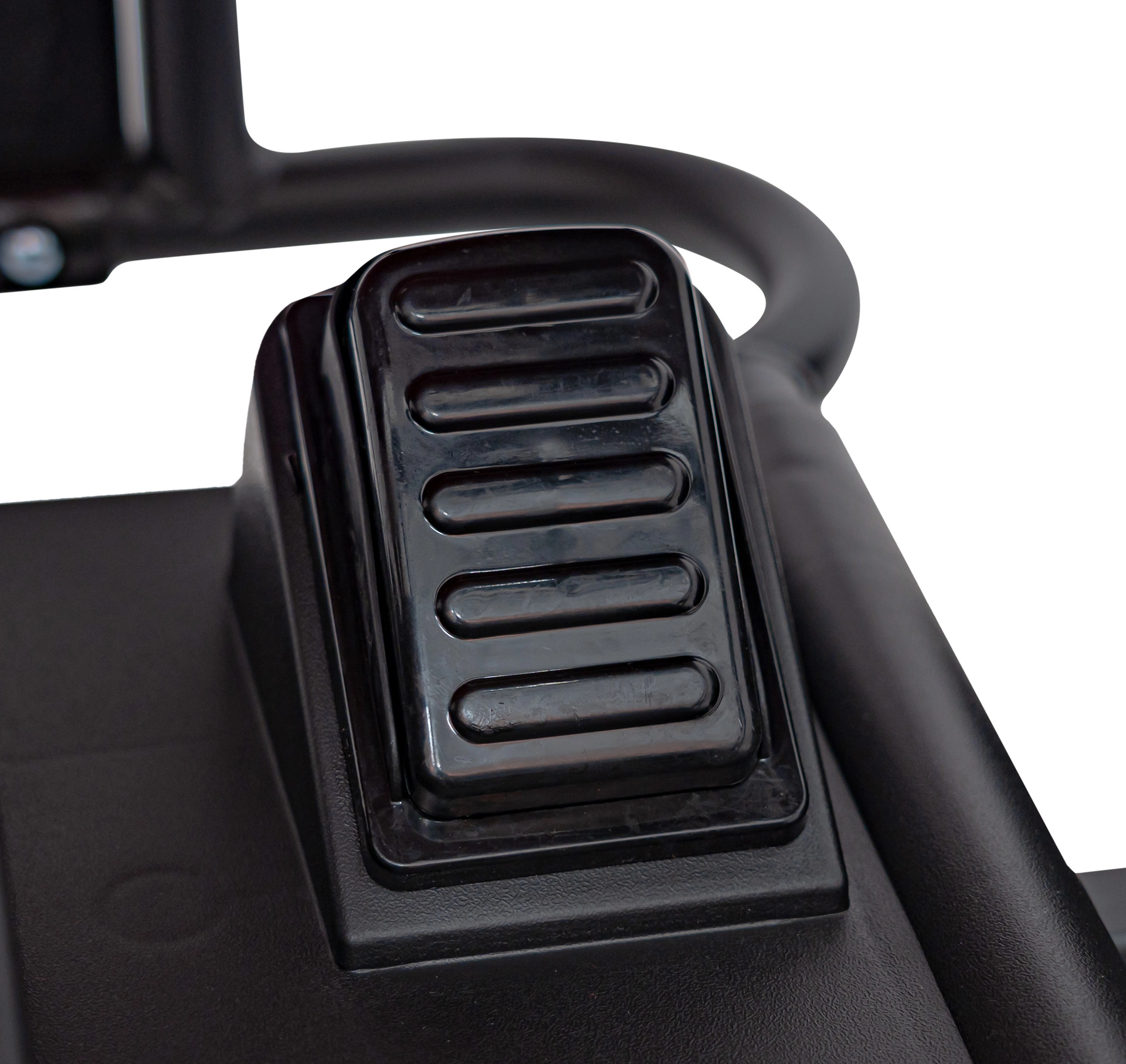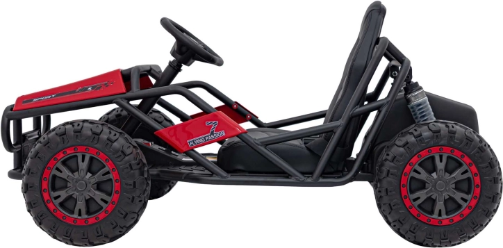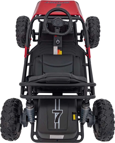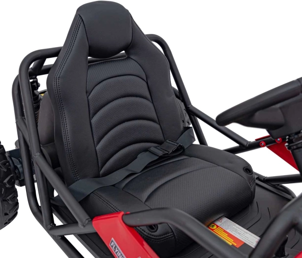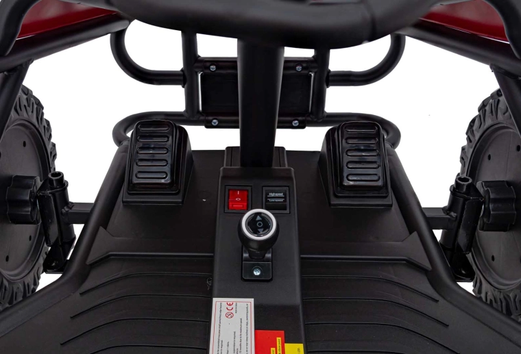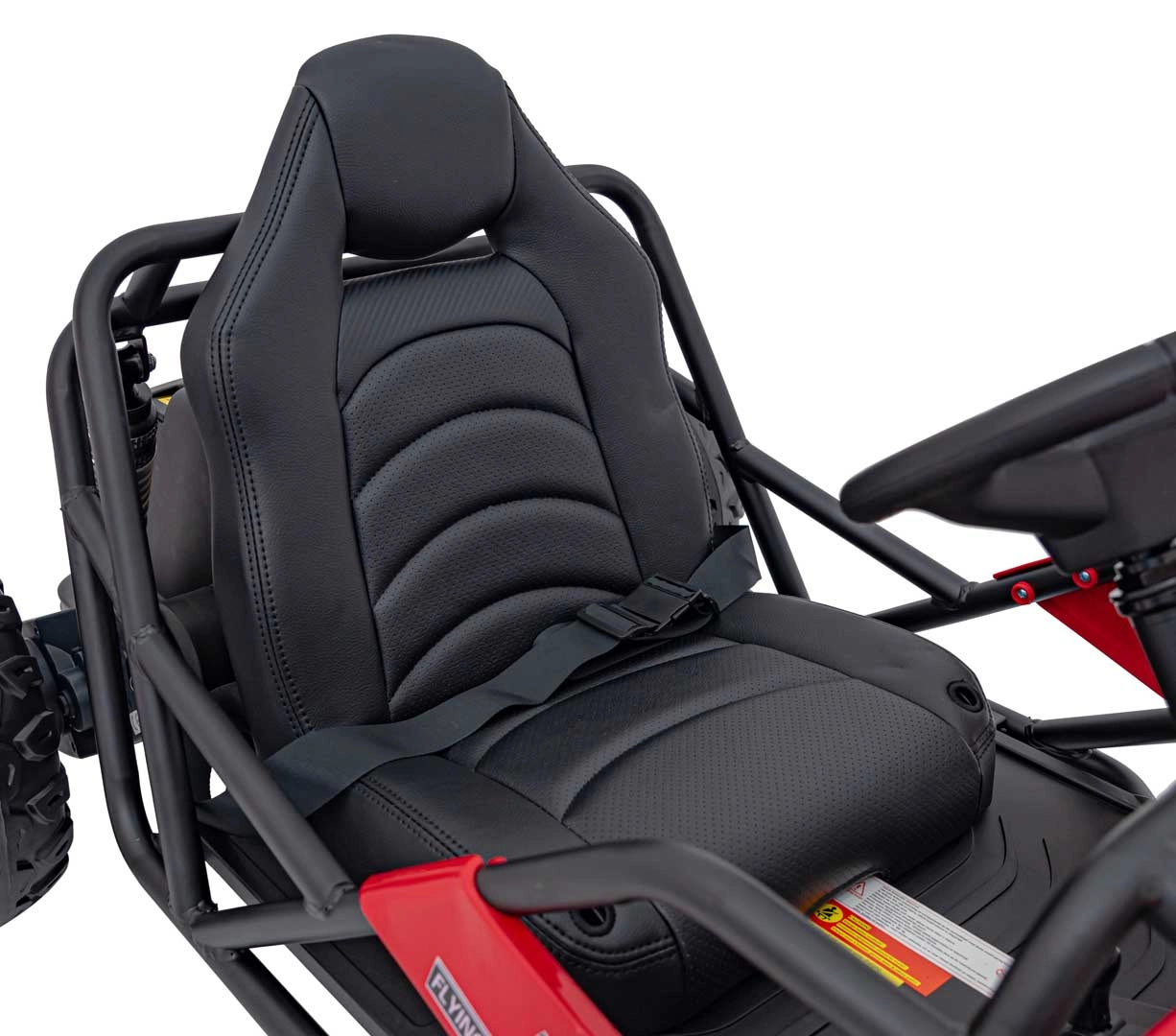 Ergonomické sedadlo z ekokůže (38 × 28 × 45 cm) s bezpečnostními pásy drží dítě pohodlně a bezpečně. Ovládání je intuitivní – jízda vpřed/vzad a plynulý pedál zajistí snadné zvládnutí prvních jízd. Konstrukce je dimenzovaná na nosnost až 60 kg, takže motokára poroste s dítětem.