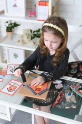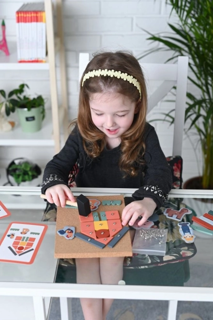 Hračky jsou ideální pro kreativní a vzdělávací hraní, které podporuje děti v navrhování a přichycení tvarů na korkové desce.