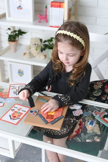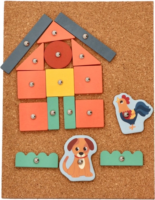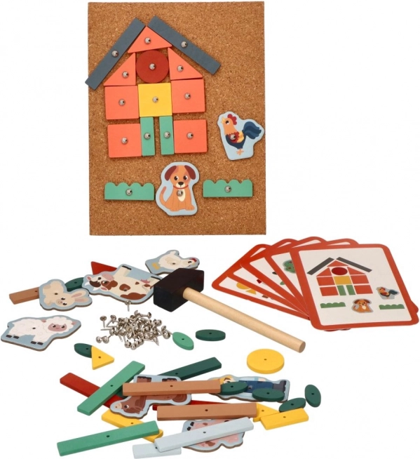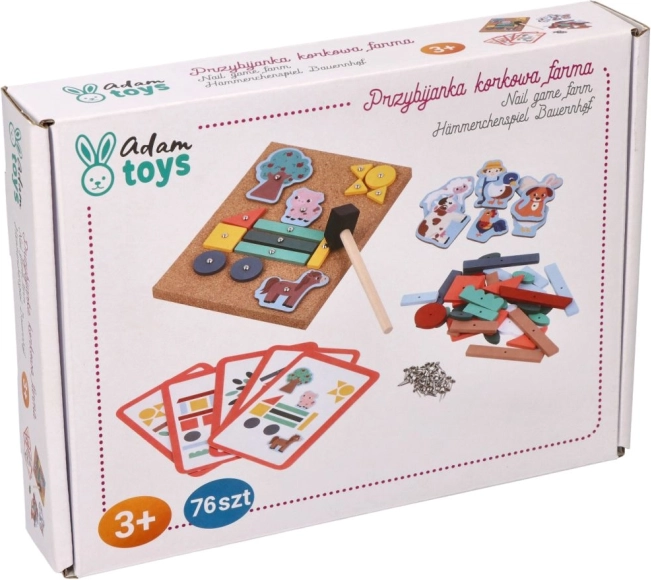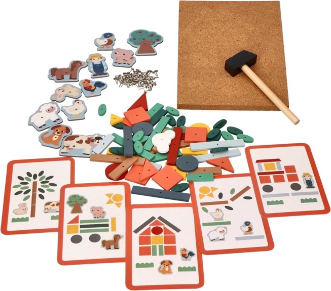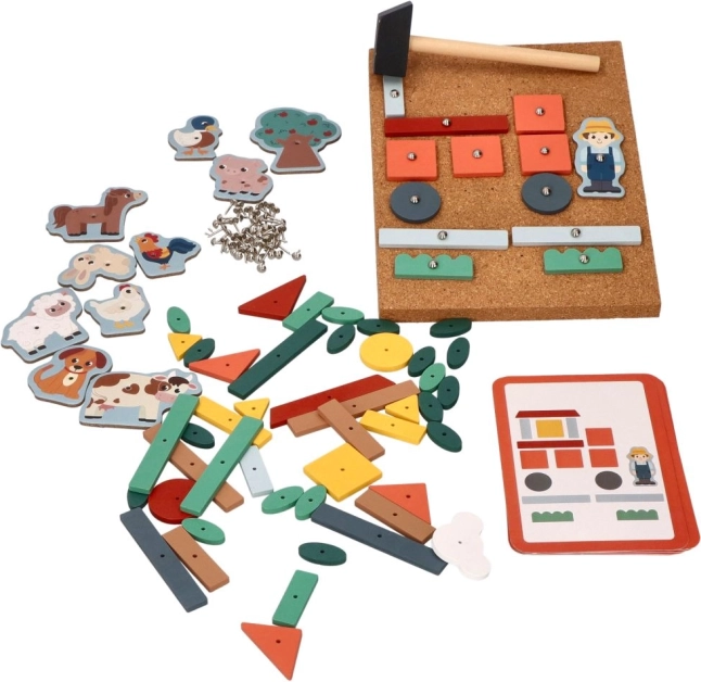 Korková příbijanka - Dobrodružství na farmě je ideálním způsobem, jak podpořit děti ve vytváření vlastních příběhů. Tento set nabízí množství barevných dřevěných tvarů a postaviček z farmy, které lze připevnit ke korkové desce pomocí malých hřebíčků a kladívka. Děti mohou pomocí instruktážních kartiček stavět různé scény a rozvíjet tak své prostorové dovednosti.