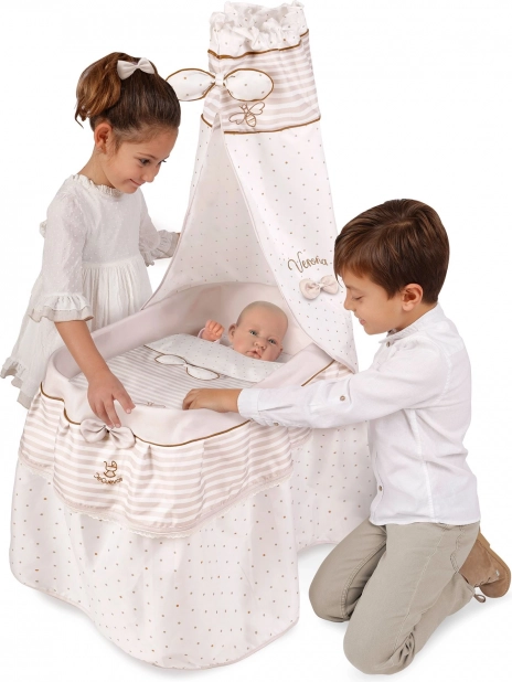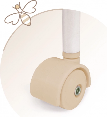 Tato stylová postýlka pro panenky je laděna do jemných pastelových tónů béžové a bílé s decentními puntíky a proužky. Přírodní vzhled doplňují mašličky připomínající okvětní lístky a drobné výšivky včeliček, které podtrhují šarm celé kolekce VERONA. Díky otočným kolečkům lze postýlku snadno přesouvat z pokoje do pokoje, aby měla malá pečovatelka své miminko vždy u sebe.