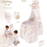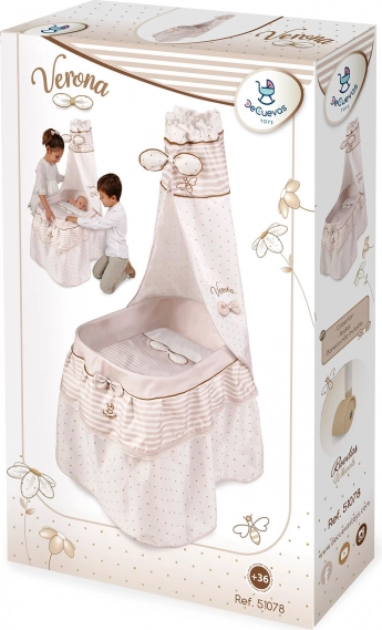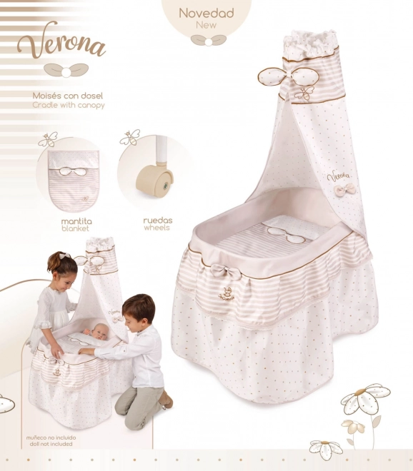 Elegantní pojízdná postýlka pro panenky z kolekce VERONA přináší jemný přírodní design, nebesy s mašličkami, pohodlnou peřinku a 4 otočná kolečka pro snadné manévrování. Precizní zpracování, lehká manipulace a bezpečné materiály potěší každou malou maminku.
