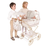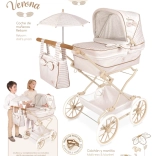 Okouzlující kočárek pro panenky REBORN Verona 2024 v kombinaci světle béžové a bílé s jemnými puntíky a proužky zaujme precizním španělským zpracováním a nadčasovým designem. Díky výškově nastavitelné rukojeti (65–90 cm) se dokonale přizpůsobí růstu dítěte a snadno se ovládá.