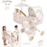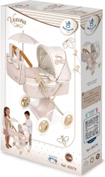 Propracovaný kočárek pro panenky v kombinaci světle béžové a bílé s jemnými puntíky a proužky nadchne každou malou maminku. Přírodní vzhled doplňují roztomilé mašličky a drobné výšivky včeliček. Díky skládací konstrukci se kočárek snadno přenáší i skladuje.
