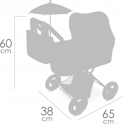 Součástí výbavy je praktický slunečník (Ø 42 cm), odnímatelná taška, kryt korbičky s očky pro uchycení, matrace a spodní úložný košík. Stabilní kovový rám, odolná kola a kvalitní textil zajišťují pohodlné a bezpečné hraní.