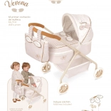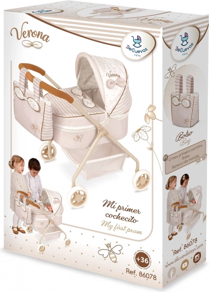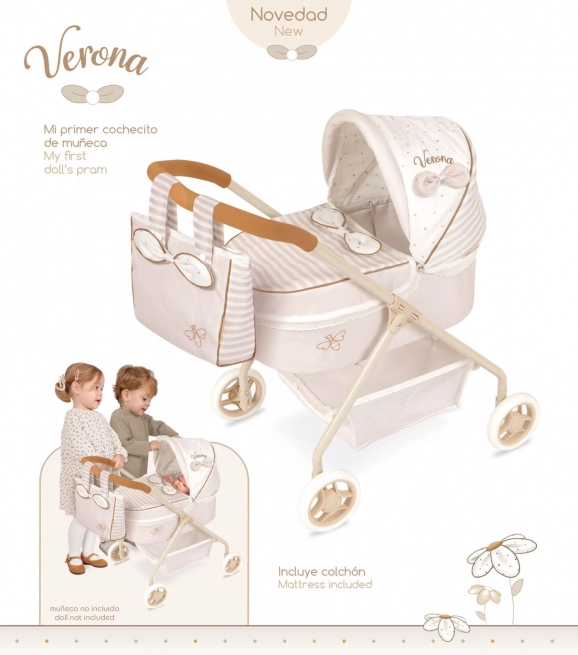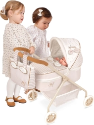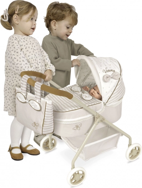 Objevte půvabný kočárek pro panenky v jemné kombinaci béžové a bílé s puntíky a proužky. Kvalitní zpracování a španělský design zajišťují dlouhou životnost, zatímco nízká rukojeť a nízká hmotnost usnadňují ovládání i těm nejmenším dětem. Styl dotvářejí dekorativní mašličky a jemné výšivky.