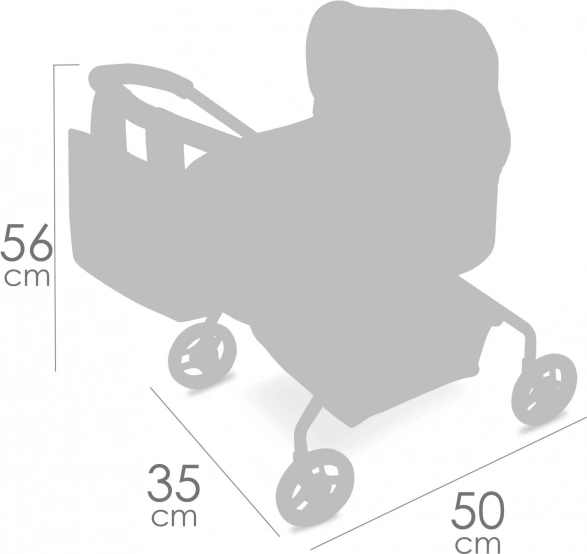 Rozměry 50 × 35 × 56 cm a lehká konstrukce jsou ideální pro malé děti. Vnitřní korbička 40 × 23 cm pojme většinu panenek.