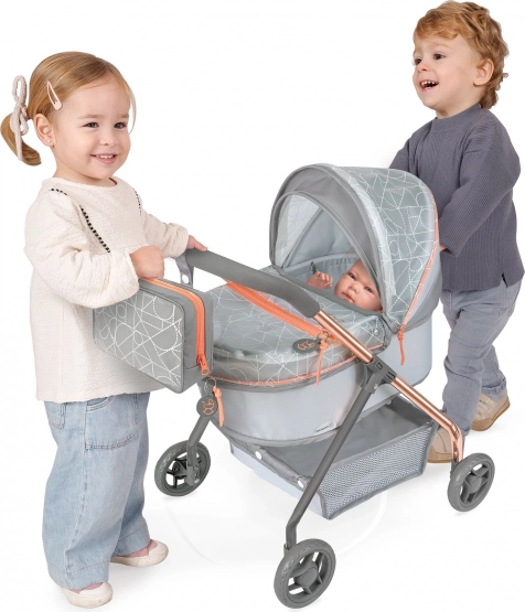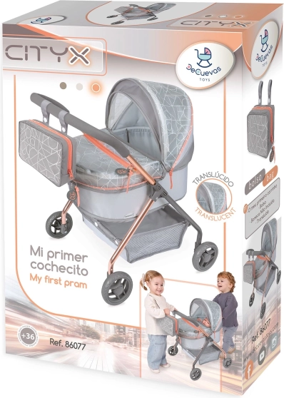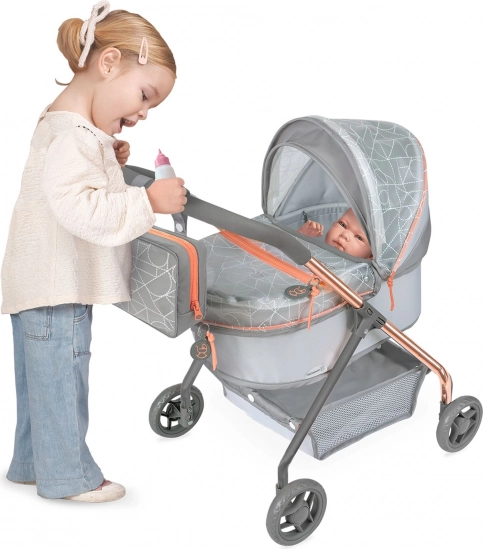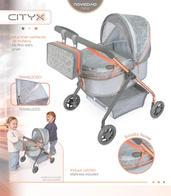 Kolekce CITY X 2024 spojuje prémiové textilie s designovým PVC s potiskem, které vytváří efekt „skleněných“ ploch. Elegantní šedo‑stříbrné provedení doplňují trendové měděné prvky, jež podtrhují lehkost a vzdušnost kočárku. Díky nízké rukojeti a stabilnímu podvozku se kočárek skvěle hodí pro úplně malé slečny a je perfektní pro role‑play a rozvoj fantazie.