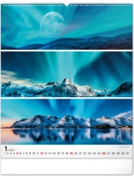 Uchvatná polární záře nad zasněženými horami lemující klidné, odrazivé jezero. Atmosféra sytých modrých barev umocňuje krásu kalendáře.