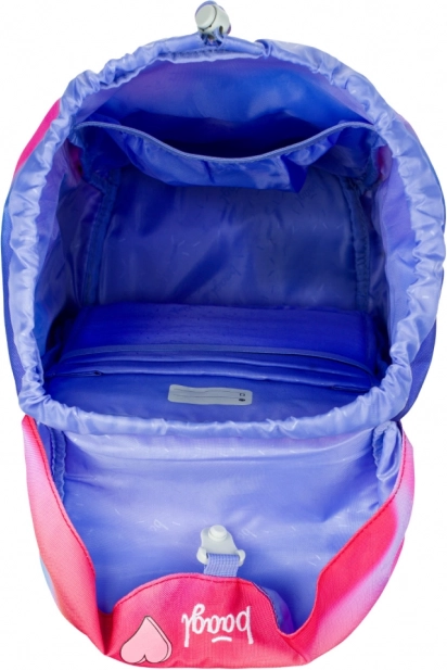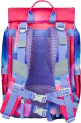 Batoh je vybaven prsními a bederními popruhy pro rovnoměrné rozložení zátěže a odlehčení těžšího obsahu. Praktické uspořádání s jednokomorou a kapsou na desky umožňuje lepší organizaci, zatímco přední kapsa na zip chrání školní svačiny. Bezpečnost v provozu zajišťují reflexní prvky.