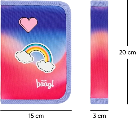 Praktický školní penál BAAGL v červeném provedení s motivem duhy je ideální pro každodenní používání. Přehledné vnitřní uspořádání se dvěma chlopněmi usnadňuje organizaci tužek, propisek, gumy či pravítka, zatímco kvalitní zip zajišťuje spolehlivé uzavření.