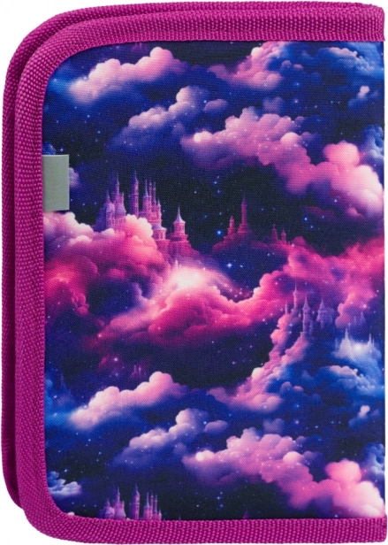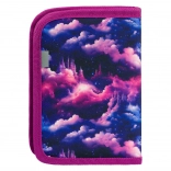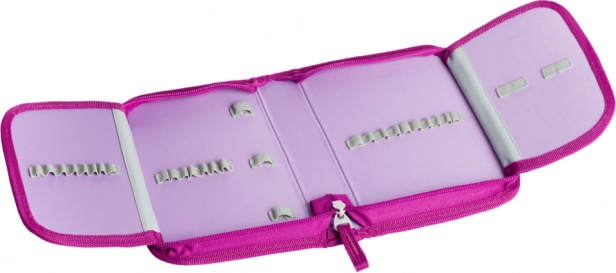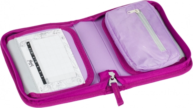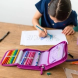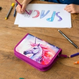 Přední stranu zdobí detailní motiv jednorožce v růžovo‑fialových tónech, který z penálu dělá nepřehlédnutelný doplněk do školy.