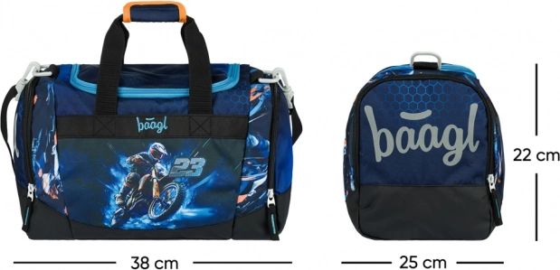 Lehká a praktická dětská sportovní taška BAAGL s motivem motorky je ideální na kroužky, tréninky i jako příruční zavazadlo. Nabízí prostornou hlavní komoru se širokým víkem pro snadné balení, samostatnou kapsu na obuv, odnímatelný nastavitelný popruh pro nošení přes rameno a vyztužené voděodolné dno. O plynulý chod se starají spolehlivé zipy YKK a reflexní prvky zvyšují bezpečnost dětí za šera.