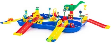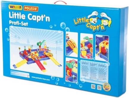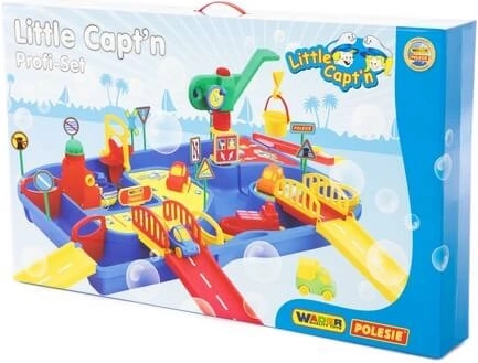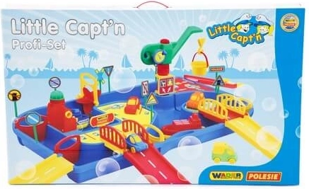 Velký vodní set Vodní svět Malý kapitán promění každou hru v dobrodružství. Děti mohou sledovat proudění vody, otevírat a zavírat zábrany, spouštět loďky a projíždět autíčky po nájezdech a mostech. Díky bohatému příslušenství si snadno vytvoří vlastní přístav a dopravní uzel.
