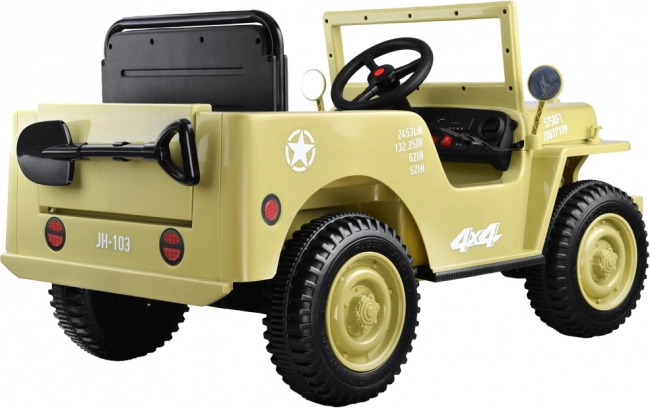 Stylový dětský jeep ve vojenském retro designu přináší skvělou zábavu doma i venku. Disponuje 4 motory 12 V, gelovou baterií 12 V 7 Ah, dálkovým ovladačem 2,4 GHz pro rodiče a koly z EVA pěny pro pohodlnou jízdu. Nechybí světelné a zvukové efekty, bezpečnostní pásy, kožené sedadlo a praktické doplňky jako otevírací kapota a kufr či saperka pro realistickou hru.