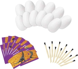 - 12 sádrových vajec, 12 figurek dinosaurů (uvnitř vajec), 12 štětců, nástroje na vykopávání, 12 informačních karet (EN)