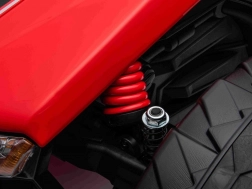 Dva motory 24V/200W a terénní kola zvládnou nerovnosti i trávník, zatímco odpružení vpředu i vzadu zajišťuje pohodlnou jízdu.