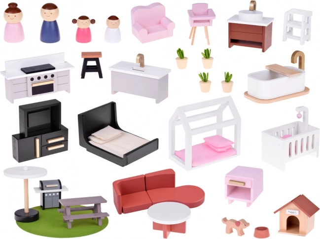 Domeček obsahuje veškeré potřebné příslušenství pro kompletní vybavení všech místností.