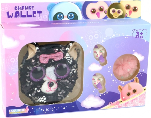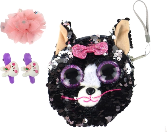 Zažijte radost vaší malé slečny s tímto krásným setem, který obsahuje několik úžasných kousků. Hlavním prvkem je peněženka ve tvaru kočičky s fialovými očky a růžovou mašlí. Perfektní nejen pro uložení malých pokladů, ale také pro každodenní užívání.