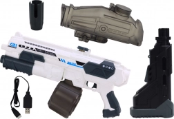 Díky dobíjecímu akumulátoru 7.4 V a přiložené nabíječce je provoz jednoduchý a ekonomický. Na rukojeti najdete praktický vypínač pro bezpečné ovládání. Moderní „space“ vzhled dodává hře futuristický náboj a podněcuje dětskou fantazii.