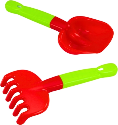 Sada zahrnuje lopatku a hrábě, které podporují fyzickou aktivitu a jemnou motoriku dětí při hraní v písku nebo půdě.