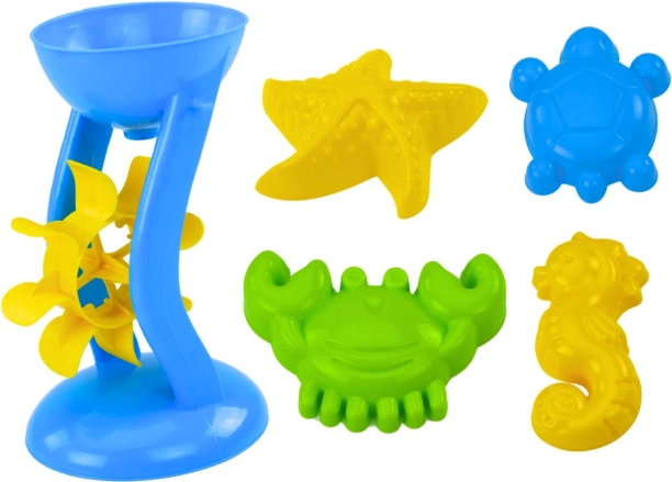 Sada obsahuje také mlýnek, který může být použit pro přelévání písku či vody. S pomocí lopatky a hrabiček mohou malí stavitelé vytvářet zamky a tunely nebo hledat skryté poklady. Čtyři mořské formičky ve tvaru koníka, rozkvěždy, kraba a želvy přidávají na kreativnosti a zábavě.