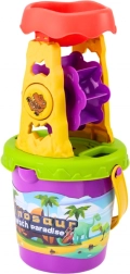 Vše potřebné v jednom: vědro s mlýnkem, sítkem a trychtýřem, lopatka, hrábě, konvička a dvě formičky pro nekonečnou zábavu na pláži i v pískovišti.