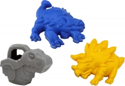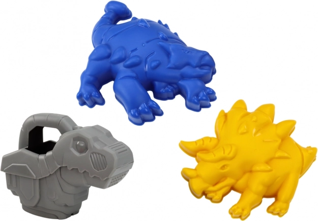Dinosauří konvička zve k vodním hrám a formičky (např. triceratops) inspirují k tvorbě tematických pískových světů.