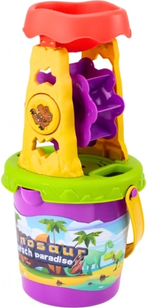 Zábavná písková sada s dinosauřím motivem pro kreativní hraní na pláži i v pískovišti. Obsahuje mlýnek na písek a vodu se sítkem a trychtýřem, lopatku a hrábě, konvičku a formičky dinosaurů. Vyrobeno z bezpečného plastu, splňuje CE/EN71.