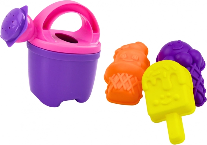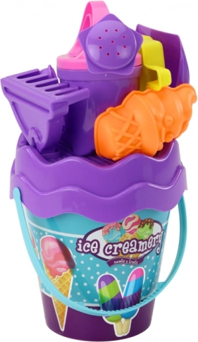 Tato pestrá plážová sada je ideální na venkovní dobrodružství. Hlavní roli hraje fialový kyblík s motivem zmrzliny a praktickým víkem, které slouží jako sítko na písek – děti snadno oddělí písek od kamínků či mušlí a vytvoří hladký základ pro své stavby.