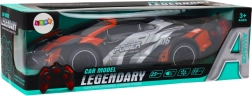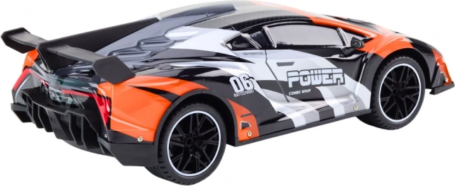 Šedo‑oranžová sportovní karoserie se závodními prvky, nápisy a zadním křídlem dodává modelu realistický vzhled.