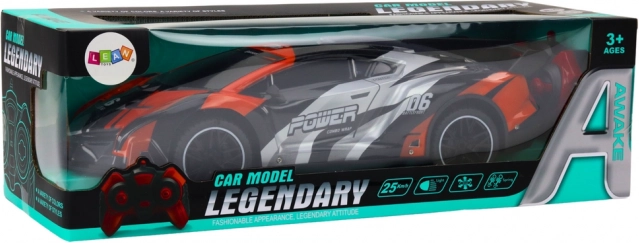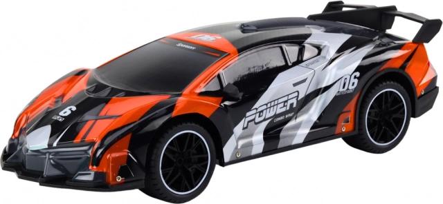 Intuitivní dvoupákový ovladač poskytuje přesné řízení směru a rychlosti. Sportovní šedo‑oranžová karoserie s nápisy a zadním spoilerem zaujme na první pohled a zvýrazní dynamický charakter vozu.