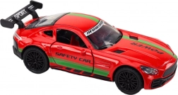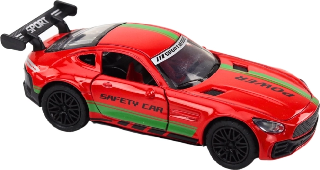 Stylové sportovní auto v měřítku 1:32 z odolného kovu nadchne malé i velké fanoušky rychlých kol. Nabízí otevírací dveře, funkční světla a zvuky po stisknutí předních kol, gumová kola pro lepší přilnavost a zpětný nátah pro rychlou jízdu. Červený lak s kontrastním zeleným proužkem a sportovní spoiler dodávají modelu dynamický vzhled.