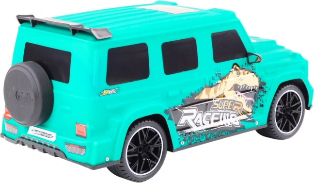 Výrazná tyrkysově zelená karoserie s grafikou dinosaura a sportovními liniemi zaručí, že auto na trati nepřehlédnete.