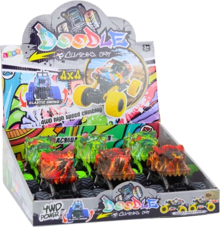 Objevte originální kombinaci světa dinosaurů a off-road aut. Terénní autíčko ve tvaru dinosaura nadchne děti svým vzhledem i jízdními možnostmi. Díky setrvačnému pohonu stačí postrčit a vozidlo se rozjede vpřed nebo vzad. Pružinově uložená kola umožňují skoky a nadzvednutí, což přidává do hry akci a napětí.