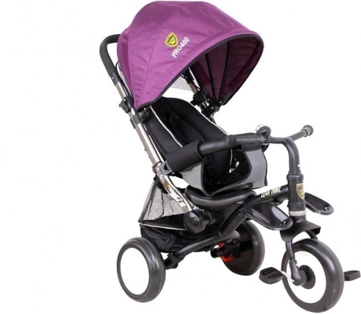 Dětská tříkolka s fialovou stříškou je perfektním nástrojem pro aktivní trávení času venku. Tato tříkolka svou konstrukcí připomíná kočárek, což dokazuje rozkládací stříška a plně nastavitelné opěradlo, díky kterým je tato tříkolka ideální od prvních měsíců dítěte až po dobu, kdy ji vymění za dvoukolové kolo.