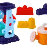 Dvě lopatky různých tvarů a tři formičky hradů usnadní kopání, plnění a tvarování. Konvička doplní vodu pro pevnější stavby.