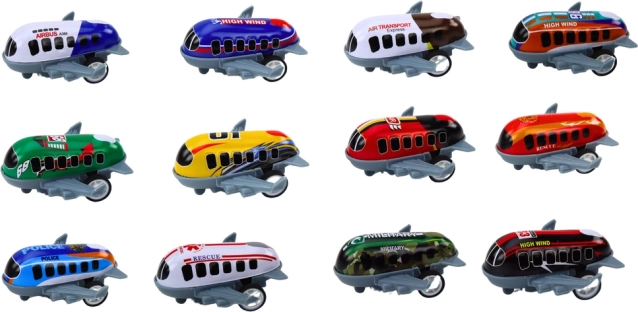 Užijte si hodiny kreativity a zábavy s touto sadou 12 hraček ve tvaru letadel. Každý model má pohon a kola pro hru na rolování. Barevná letadla s popisy jako „High Wind“ a „Air Transport“ inspirují dětskou fantazii.