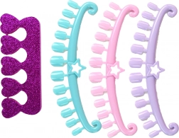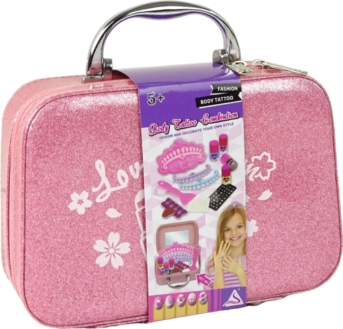 - Růžový třpytivý kufřík se zrcátkem, 4 barevné laky na nehty, oddělovač prstů, pilník, razítko, razítkovací destička se vzory, škrabka/špachtle, 3 šablony na tipy, nálepky na tipy, samolepky a kamínky, malý kontejner