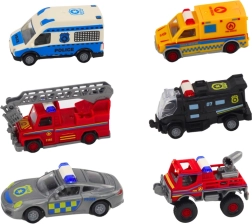 Souprava obsahuje šest vozidel, jako je policejní, hasičský a zdravotnický vůz pro realistické herní situace.