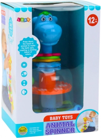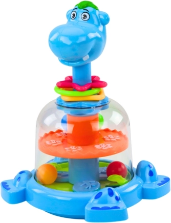 Interaktivní hrošík potěší pestrými barvami a jednoduchým ovládáním. Stisknutím hlavičky se v bříšku roztočí kolečko a 4 barevné kuličky se dají do pohybu. Děti sledují, jak kuličky skáčou a mění směr, což podněcuje jejich zvědavost a soustředění.