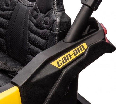 Černé sedadlo s čalouněním a značkou Can-Am poskytuje pohodlí a bezpečí, které děti při jízdě potřebují.
