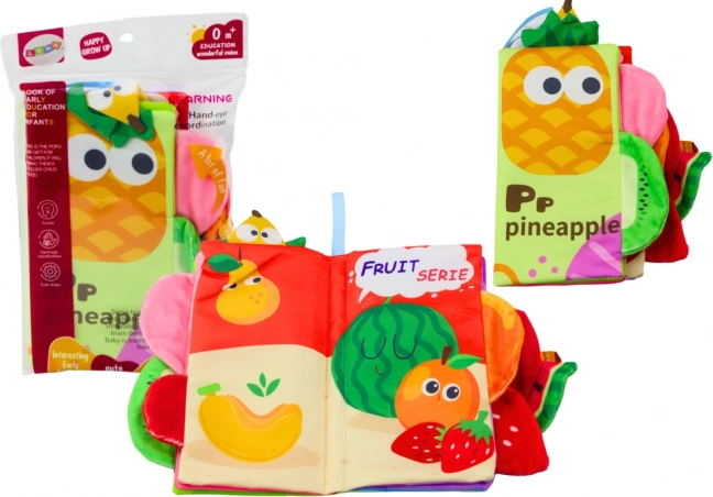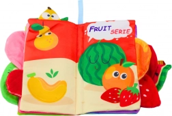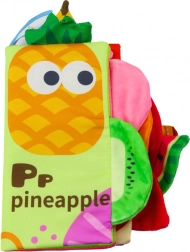 Objevte hravou senzorickou knížku pro nejmenší, která spojuje barvy, zvuky a dotek. Díky šustícím stránkám, pískacím prvkům a bezpečné měkké tkanině podporuje rozvoj smyslů i jemné motoriky. Ilustrace s anglickými názvy ovoce učí první slovíčka a díky šňůrce ji snadno připevníte na kočárek – ideální společník na cesty.