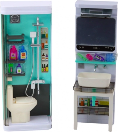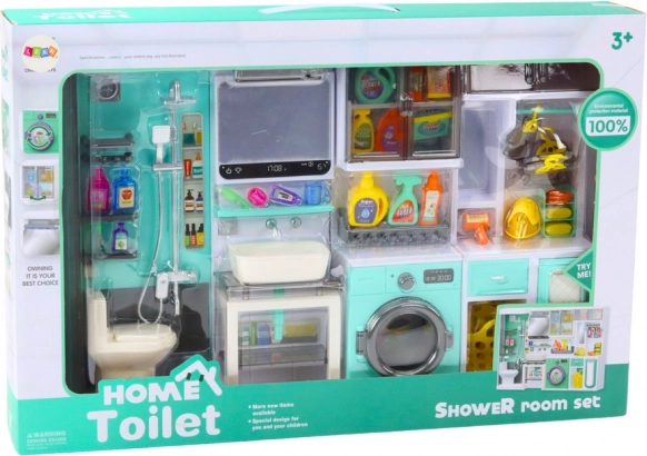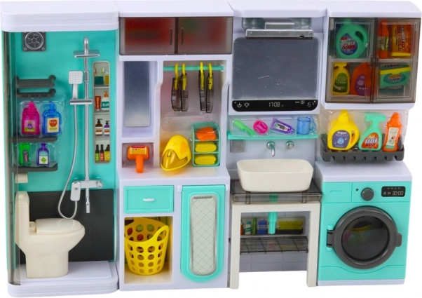 Tento promyšlený set se skládá ze 4 propojených segmentů: sprchového koutu s toaletou, umyvadla se zrcadlem, pračky se skříňkou a polic se žehlicím prknem. Tyrkysovo-bílý design a precizní zpracování podporují představivost a motivují děti k napodobování běžných činností. Rozměry sestavy 35 × 26 × 8 cm skvěle padnou do dětského pokojíčku i k domečku pro panenky.