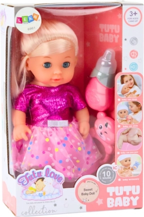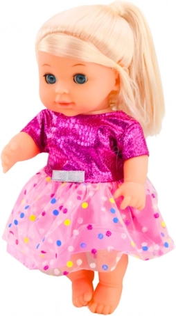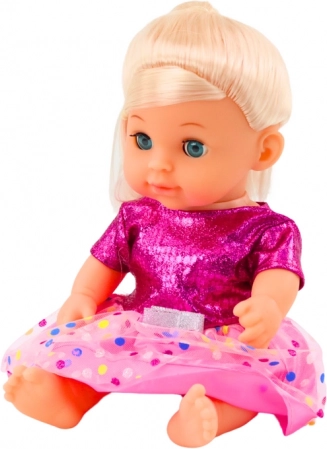 Roztomilá panenka v růžových šatech s puntíky potěší každé dítě. Nabízí realistickou hru díky funkci čůrání po napití z lahvičky, zábavné zvukové efekty a pohyblivé končetiny. Součástí je i chrastítko pro ještě více zábavy a rozvoj fantazie.